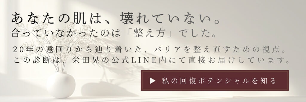 つまり私の肌が”なぜ荒れ続けるのか”、LINE登録で無料診断+トライアル特別価格でお届けします。