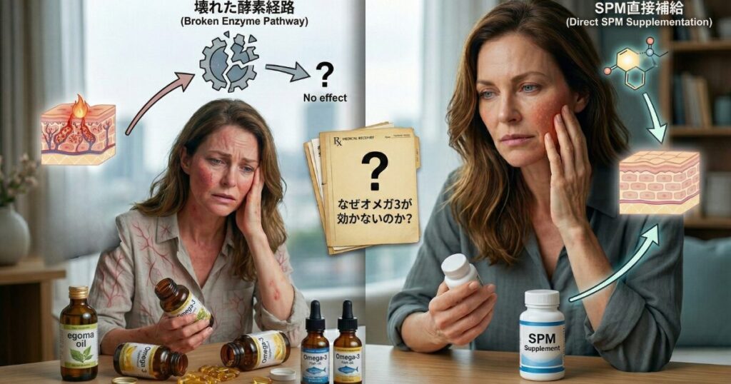 問題は、長年の炎症やステロイド使用によって、「オメガ3→SPM」に変換する酵素経路が弱まっている方がいるということ。ガソリンを入れてもエンジンが動かない状態。だからいくら飲んでも変わらないんです。